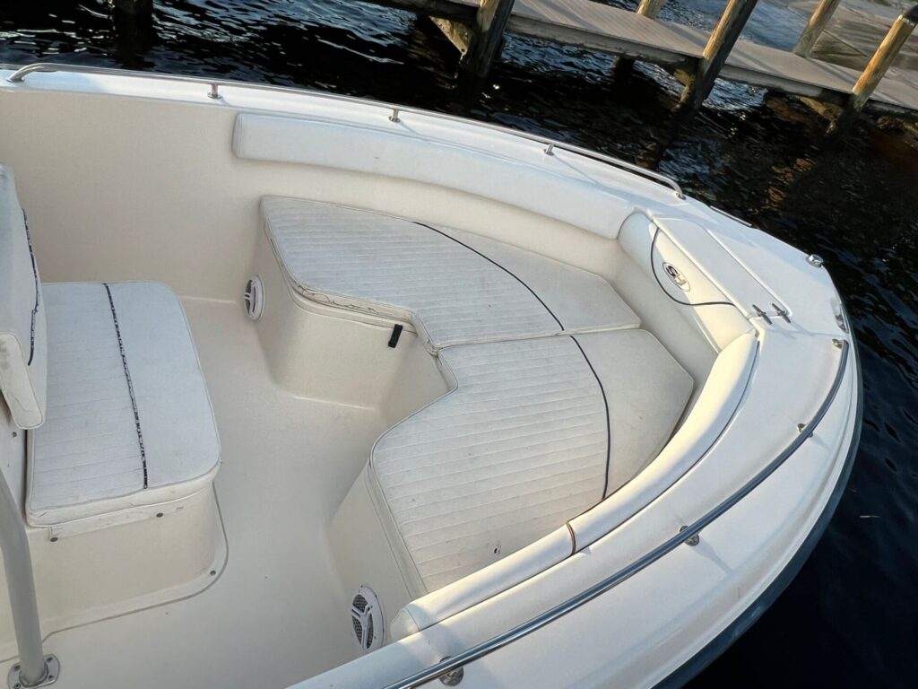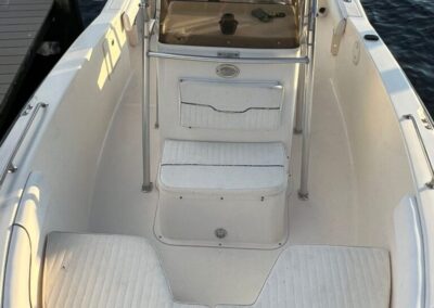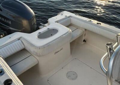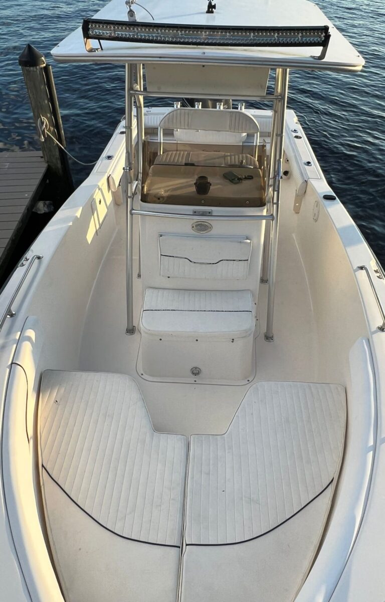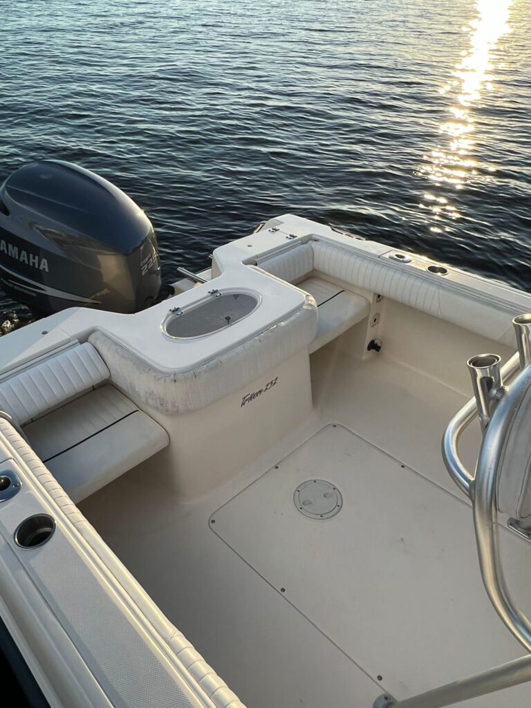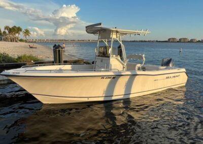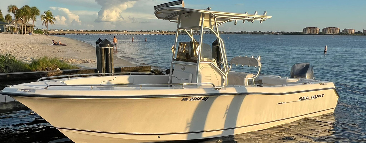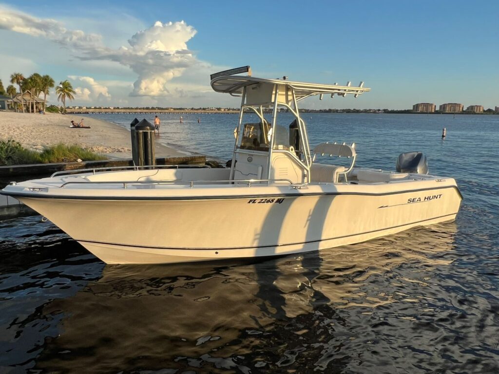 This Sea Hunt 232 Triton comes with a Yamaha 225 four-stroke engine and a recently added hard roof T-top. The easy-access center console houses an enclosed area for plenty of storage.