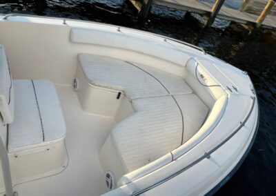 Also includes a plexiglass windscreen, plenty of storage, a vertical rod rack and a large light on the front and rear of the T-top for docking or navigating. The raised forward casting platform has storage and a forward anchor locker.