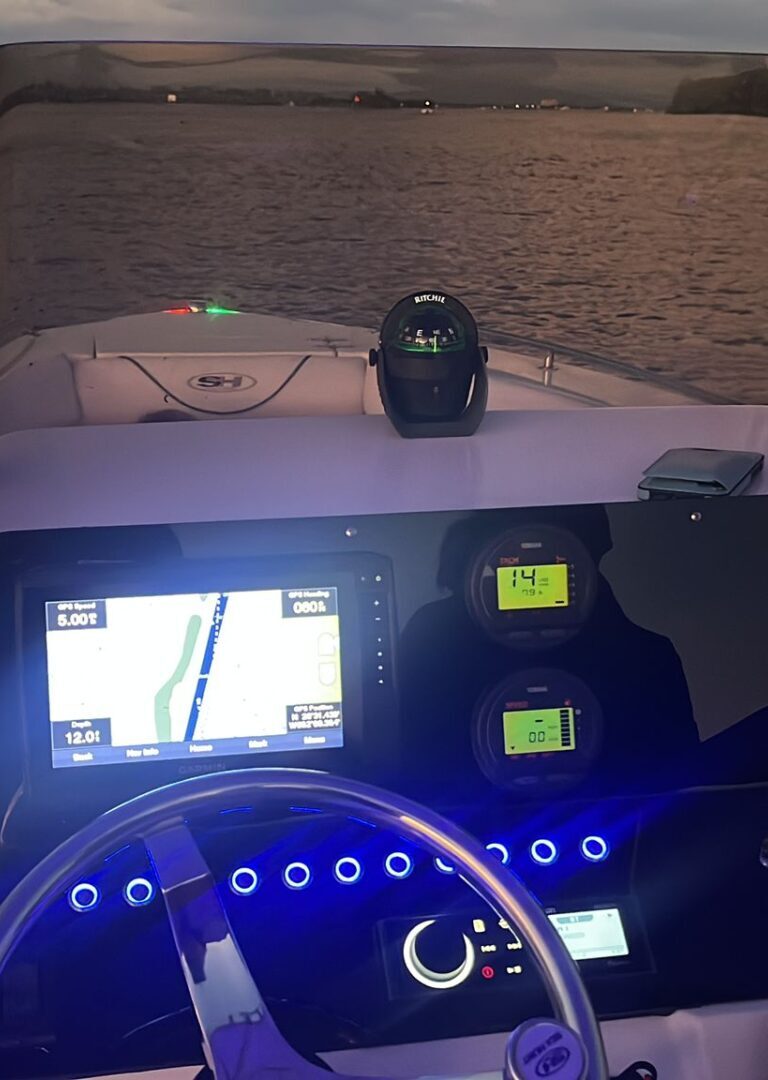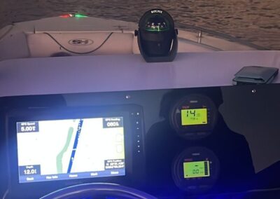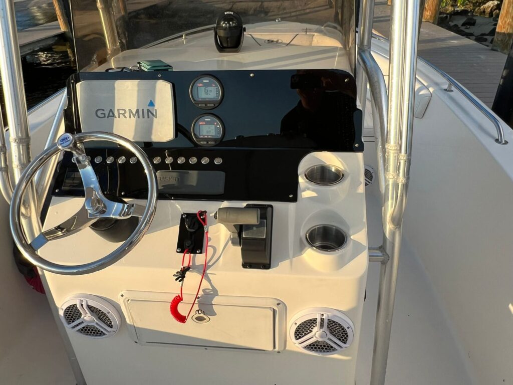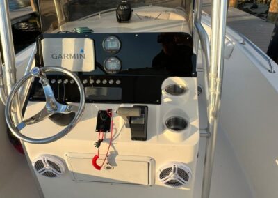 The boat has a recently installed audio marine sound system that really rocks out. At the helm are the Garmin 94SV GPS-fishfinder and a VHF radio.